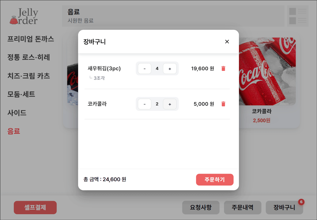 아래 화면은 고객이 매장에 방문하여 태블릿에서 주문하는 화면이다. 메뉴별로 맵기, 추가옵션 등 다양한 옵션을 넣어 주문할수 있고, 점원을 부르는 요청사항도 별도로 구현돼 있다. 토스페이를 통해 셀프결제도 가능하고, 카운터 결제도 가능하게 하여 테이블오더에 필요한 대부분의 기능이 온전히 구현돼 있다.