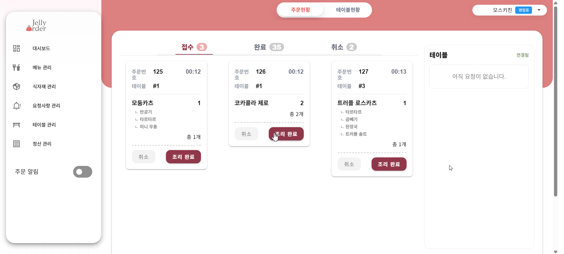 음식점에 가서 테이블 오더를 써본적 있는 사람이라면 누구나 알만한 테이블오더를 개발하였다. 그런데, 그 디테일이 실제 시장에서 사용되는 것 이상으로 잘 뽑아내었다. 먼저, 아래 화면은 점주가 보는 대시보드이다. 점주는 주문이 들어오면 소리와 함꼐 대시보드가 실시간으로 변경되는것을 확인할수 있다.