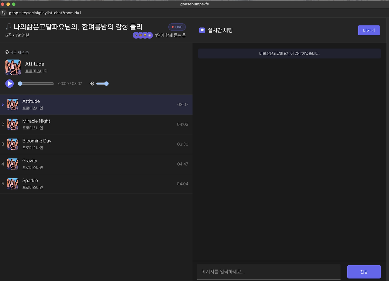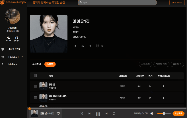 실시간 음원 스트리밍 서비스에 도전한 구스범스 팀 또한 탁월한 서비스를 개발하였다. 실시간으로 플레이리스트를 가지고, 음원을 재생한다.