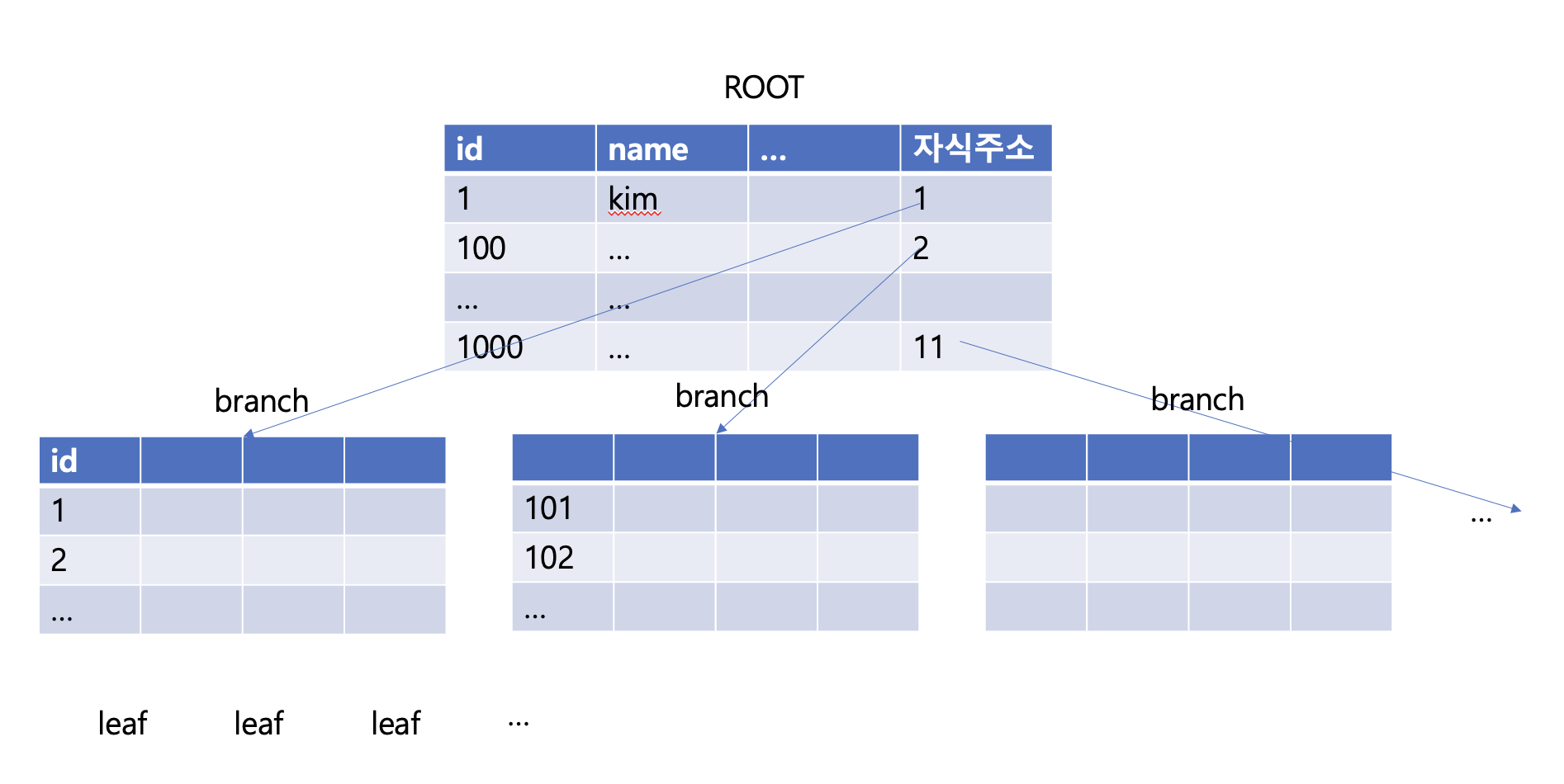 -계층 구조로 구성된다는 것의 의미는 아래의 그림과 같이 index테이블의 계층적 구성을 의미한다. 아래의 계층구조는 id의 인덱스 테이블이다. 이 계층구조는 편의상 root와 branch만을 그린 것이고, 데이터의 양과 엔진의 설정에 따라 더 다층구조를 가질수도 있고 더 짧은 구조를 가질수도 있다.