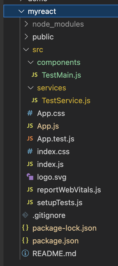 리액트 프로젝트의 구조는 아래와 같다. 최초 create 시켰을때는 components 폴더와 services폴더가 없었을 것이다. 일단 2개 폴더에 TestMain.js, TestService.js 파일 2개를 깡통으로 만들어 두자.