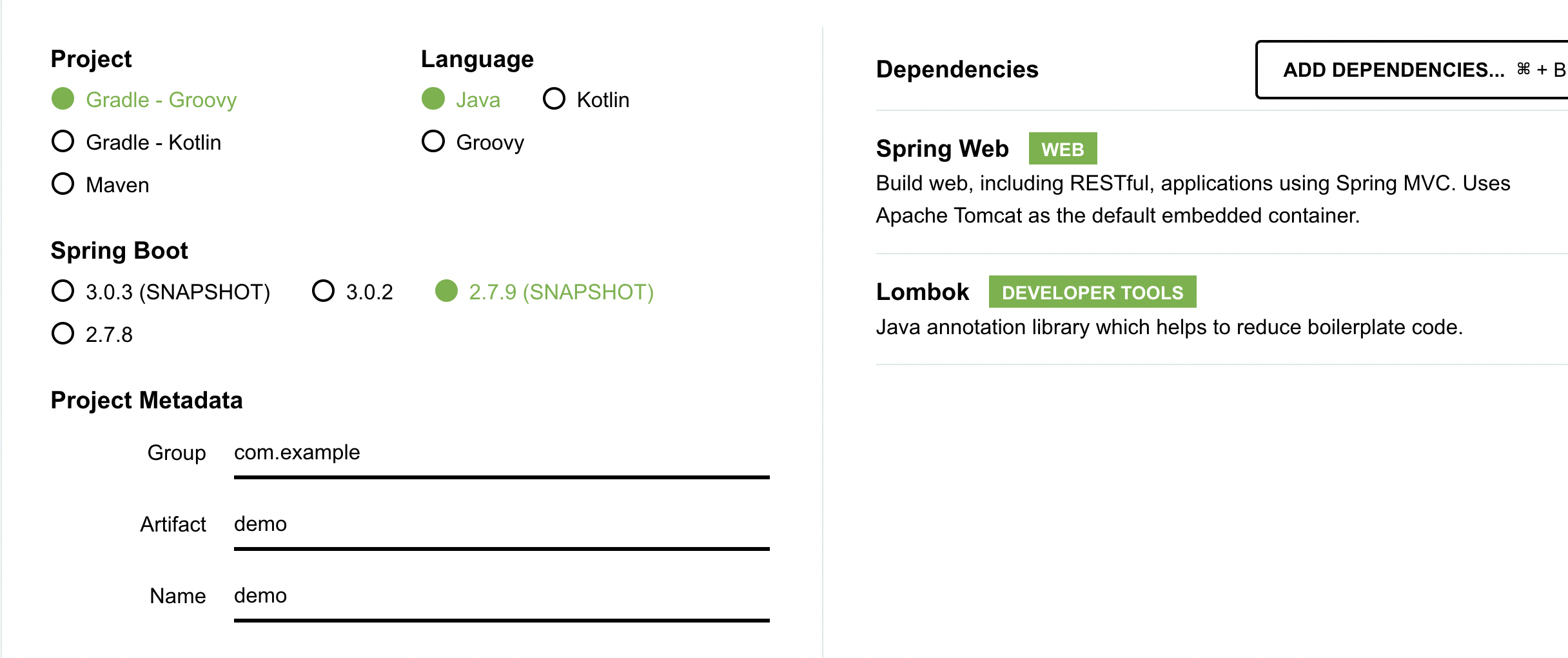 서버에서는 별도의 DB세팅 없이, 간단한 JSON형태의 데이터만 생성하고자 하니, 아래와 같이 gradle빌드에, Web, Lombok정도만 depency를 추가한 프로젝트로 심플하게 구성하자.