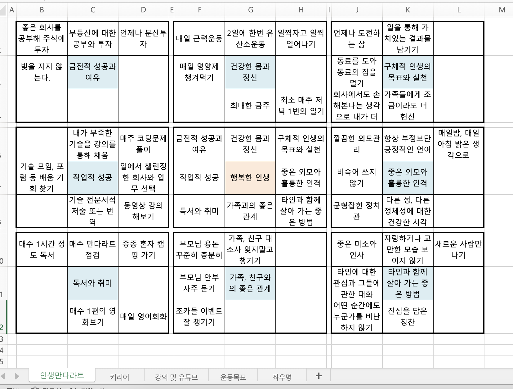 나 또한 아래와 같은 방식으로 엑셀을 가지고 인생만다라트를 관리하고 있다. 매번 바뀌기도 하기에, 지속적으로 수정해가면서 내가 인생에서 어떤길로 가고 있는지를 매일 또는 최소한 매주 1번은 점검하고 있다.